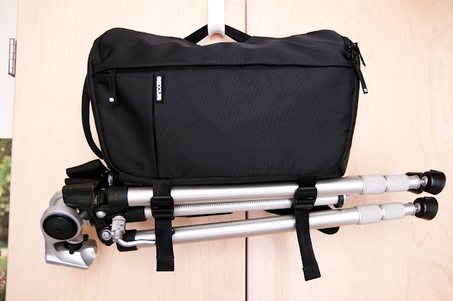 Those tripod straps that I mentioned earlier will accommodate a tripod of just about any size, but anything bigger than a travel-size tripod (think Benro Travel Angel) will unbalance the bag and make it very uncomfortable. That, and you'll probably end up hitting yourself or others in the head with it.