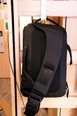 It is pretty minimalistic looking - no obscene pockets, straps, or logos - and is constructed mostly from nice-looking high-denier nylon. The straps look like they were pulled from airline seatbelts - a nice touch. It has soft padding pretty much everywhere, and straps on the side so you can carry a tripod.