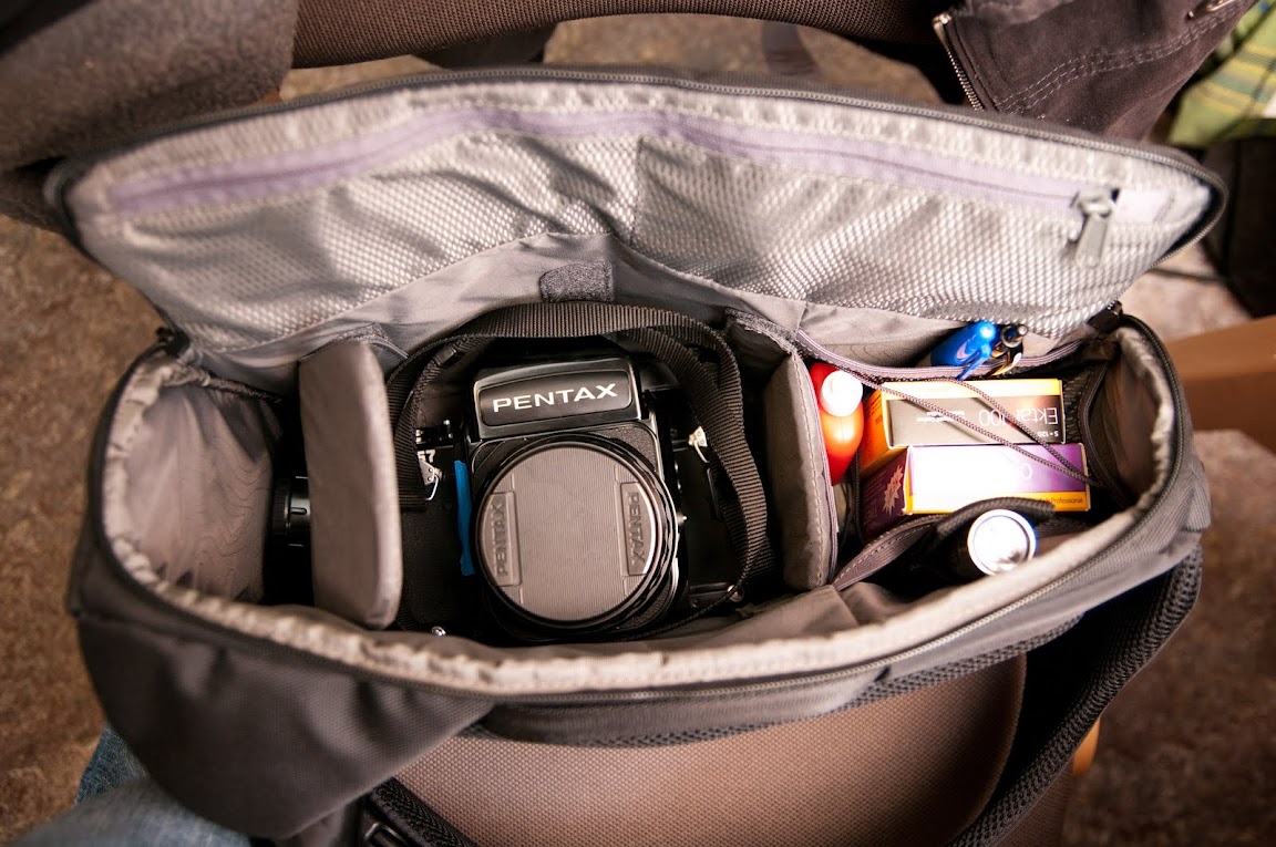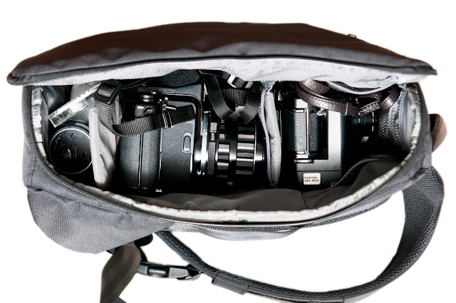 The Incase has a grand total of. . . . two compartments! Frankly, only one of these really matters, and that is the main compartment. That said, the small size of the bag is really quite deceiving, it can swallow up my Pentax 67 with room for more!